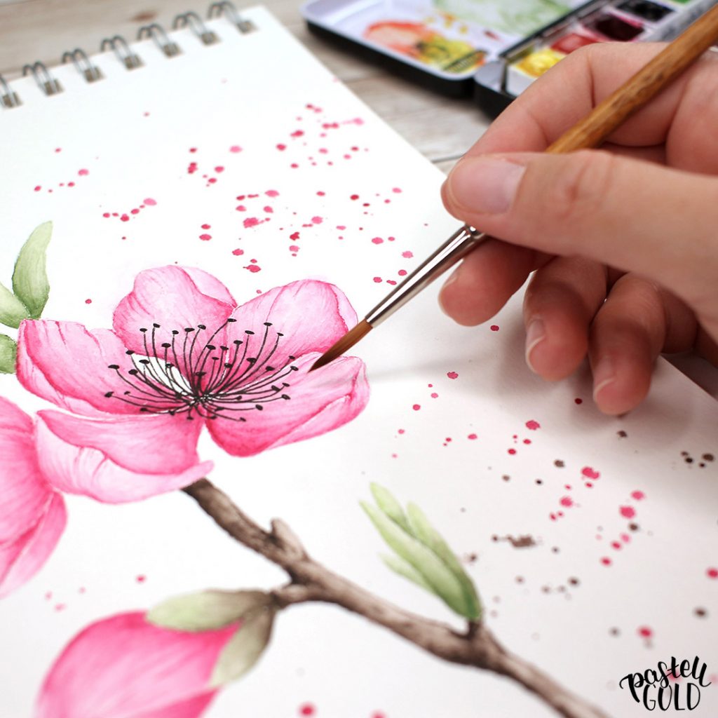 Male mit mir einen Pfirsichblütenzweig mit Aquarellfarben. Sanfte Farbverläufe, Schatten an der richtigen Stelle und feine Details sorgen dafür, dass deine Blüte richtig lebendig aussieht. Bist du dabei und gönnst dir den Kurs?