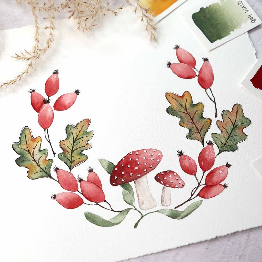 Male mit mir zwei Herbstkränze und lerne ganz nebenbei die Aquarell Basis Techniken. Im Kurs widmen wir uns ausführlich den Basis Techniken (die richtige Wassermenge, die Nass-in-Nass Technik, sanfte Farbverläufe). Diese Techniken wenden wir direkt an einem separaten Herbstkranz an, damit sich Üben nicht wie Üben anfühlt. Der Kurs ist daher ideal für Einsteiger:innen geeignet.