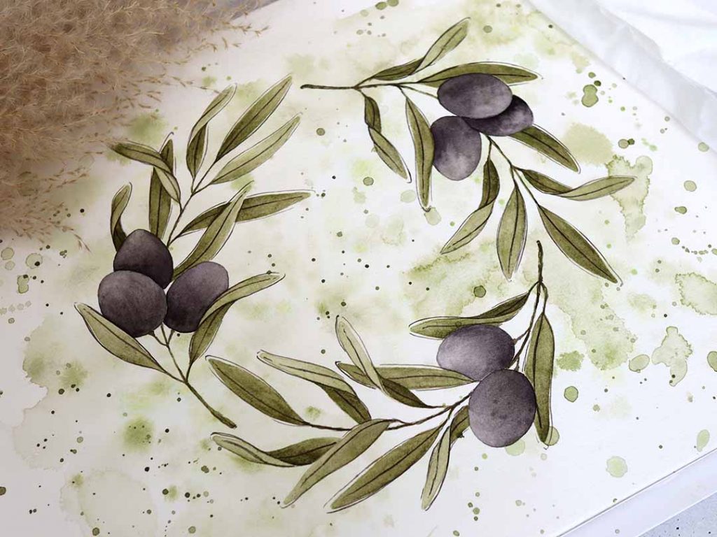 Lass uns Olivenzweige mit Aquarellfarben illustrieren, wundervolles Olivgrün mischen, spannende Hintergründe anlegen und mit Details WOW-Effekte erschaffen. Du bekommst im Kurs-Guide alle Vorlagen für die Olivenzweige und natürlich auch für den Kranz aus Olivenzweigen.