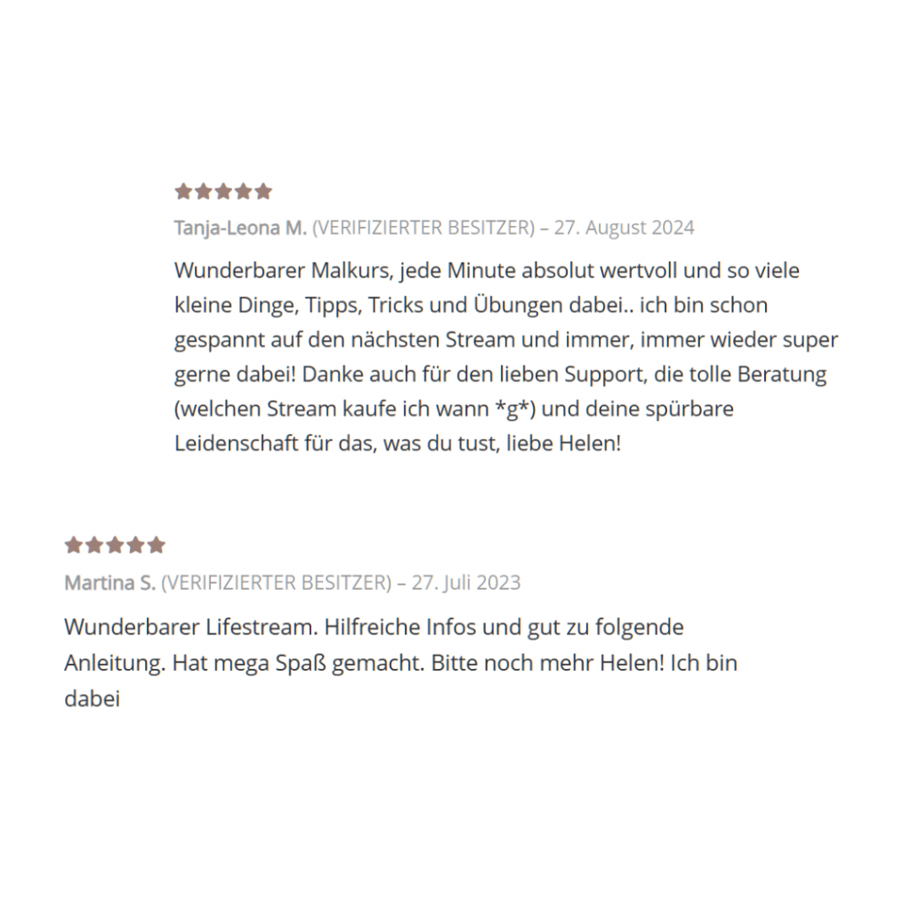 Meine Live-Kurse finden online und in Echtzeit statt. Das heißt, wir treffen uns an einem bestimmten Termin und malen gemeinsam. Alle Live-Kurse werden aufgezeichnet und stehen den Teilnehmenden in der Kursplattform dauerhaft zur Verfügung. Nachholen & Wiederholen – kein Problem.