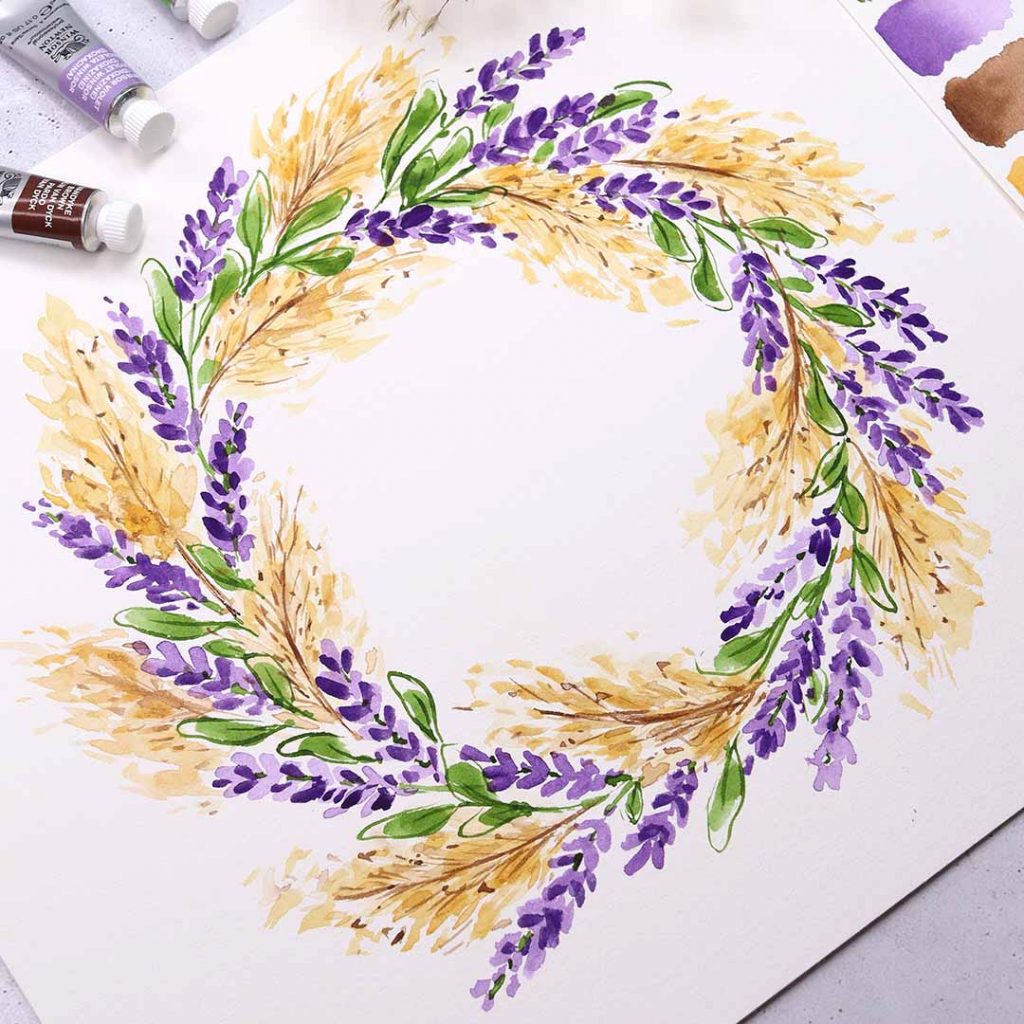 Im Kurs malen wir einen spätsommerlichen Kranz aus fluffigem Pampasgras und elegantem Lavendel im Loose Watercolor Stil.